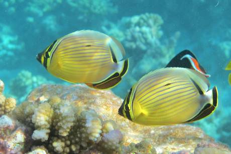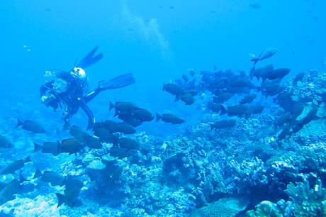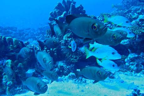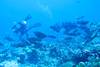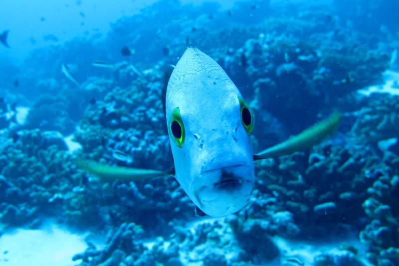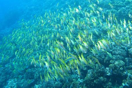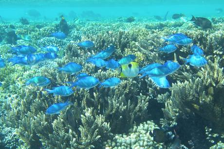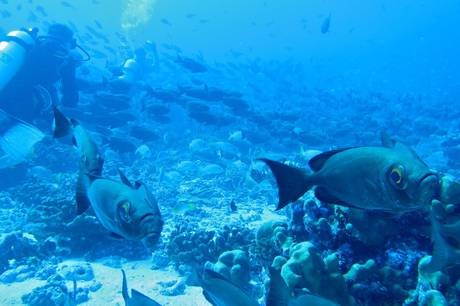 wenn wir Abfälle ins Wasser werfen sind sie ganz schnell da: die ulkigen Langnasendoktorfische...
